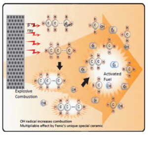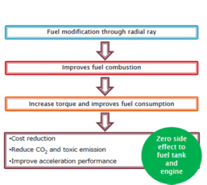 • PT energizes diesel fuel passing through it. This catalytic reaction modifies and breaks fuel hydrocarbon molecules to shorter lighter molecules. Thus increases its surface contacts attracting more hydrogen for better, more efficient and complete combustion.