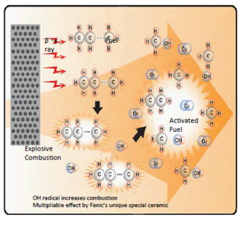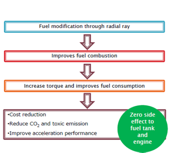 • PT energizes diesel fuel passing through it. This catalytic reaction modifies and breaks fuel hydrocarbon molecules to shorter lighter molecules. Thus increases its surface contacts attracting more hydrogen for better, more efficient and complete combustion.